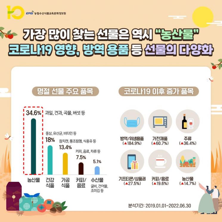 농림수산식품교육문화정보원(농정원)은 코로나19 엔데믹 이후 첫 명절을 맞아 코로나19가 선물 문화에 어떤 영향을 끼쳤는지 파악하고자 2019년 1월1일부터 온라인 뉴스, 커뮤니티, 블로그 등에 게재된 227만건 이상의 데이터를 분석했다.