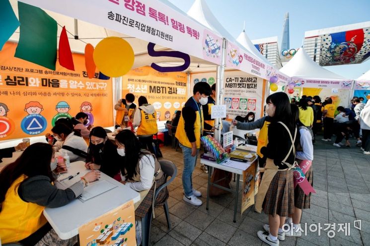 25일 서울 송파구 올림픽공원 평화의광장에서 열린 '제4회 송파 교육박람회'에 참가한 청소년들이 심리상담을 받고 있다./강진형 기자aymsdream@