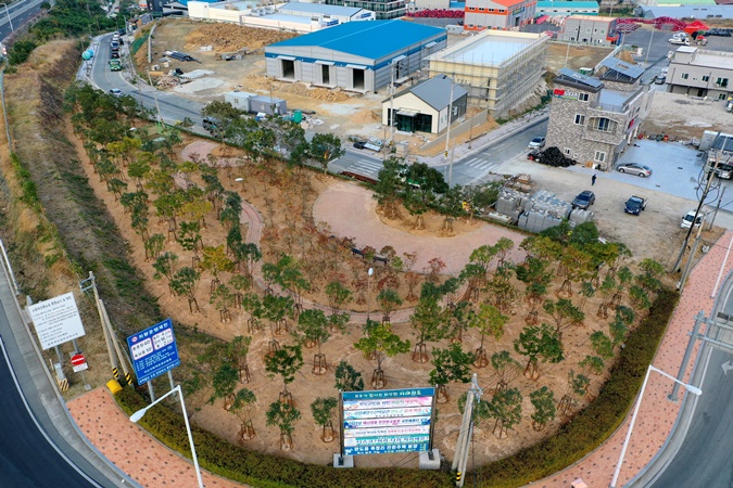 농공단지 사거리의 숲은 연안여객선터미널 숲과 달리 공원 형태로 조성됐으며, 미세먼지 저감 효과를 극대화할 수 있도록 대형 나무 위주로 식재를 했다.