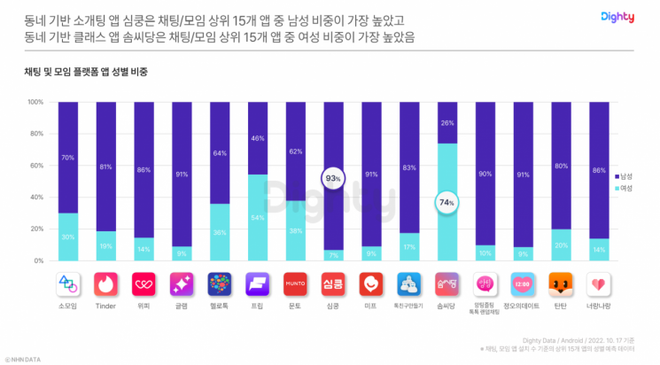 4일 NHN데이터의 '하반기 앱 트렌드 리포트'에 따르면 올해 하반기 채팅 및 모임 플랫폼 1위 앱은 동네 기반의 취미 모임 서비스인 ‘소모임’이었다. ‘소모임’은 거리두기 해제로 인한 오프라인 모임 활성화에 힘입어 ‘틴더’, ‘위피’ 등의 소개팅 앱들을 제치며 해당 카테고리에서 압도적인 설치수로 1위를 기록했다.