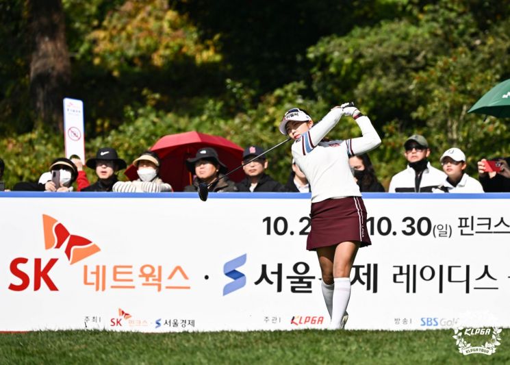 배소현이 지난달 28일 제주 핀크스GC에서 열린 KLPGA투어 'SK네트웍스-서울경제 레이디스 클래식' 2라운드 1번홀에서 티샷하고 있다.[이미지출처=연합뉴스]