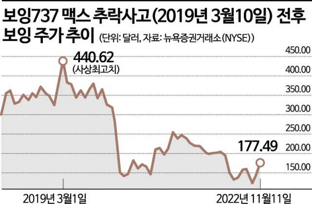 주가 부진도 지속되고 있다. 보잉의 주가는 지난 11일 기준 177.49달러로 연초 대비 32% 이상 빠진 상태다. 중국 정부가 737 맥스 기종의 상업이용 금지를 발표하기 직전인 2019년 3월 초, 사상 최고치인 440.62달러를 기록했던 보잉사의 주가는 3년 넘게 회복되지 못하고 있다.