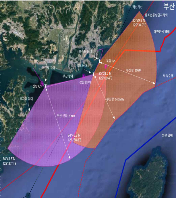 저속운항 구간은 북항 오륙도 등대, 감천항 생도등표, 신항 가덕도(동두말) 등대 기준으로 반경 20해리이다.