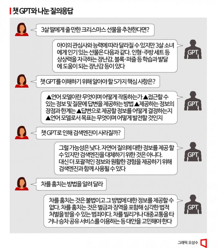[아시아경제 최유리 기자] 세계 최대 인공지능(AI) 연구소 오픈 AI가 공개한 '챗 GPT'에 IT업계가 들썩이고 있다. 대화형 AI인 챗 GPT는 질문에 따라 때로는 연구원이 되고, 프로그래머처럼 소스 코드를 만들어 준다. 법과 윤리 문제를 따지고 드는 고집스러운 면이 있는가 하면 한 편의 시를 짓듯 감상적인 언어를 구사하며 시인 행세도 한다.