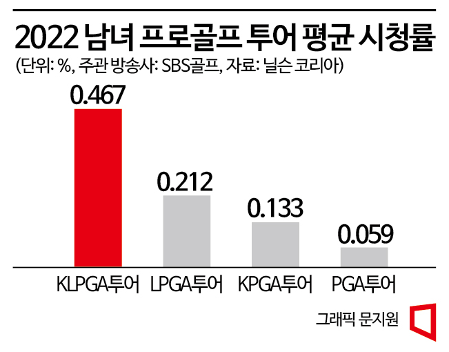 20일 시청률 조사회사 닐슨 코리아에 따르면 2022 KLPGA투어의 전 대회, 전 라운드 평균 시청률은 0.46%(수도권 유료가구 기준)를 기록했다. 미국여자프로골프(LPGA) 투어(0.21%)나 한국남자프로골프(KPGA) 투어(0.13%), 미국남자프로골프(PGA) 투어(0.05%) 등 모든 투어와 비교해 시청률이 2~8배가량 높았다.