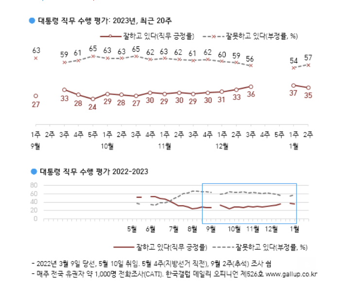 12일 여론조사기관 갤럽이 공개한 자체 정례 여론조사(10일~15일 전국 만 18세 이상 성인남녀 1002명을 대상으로 전화 조사원 인터뷰 방식으로 진행)에 따르면 윤 대통령이 지지율은 지난주 조사보다 2%포인트 하락한 35%를 기록했다. 지난해 11월3주 이래로 이어졌던 윤 대통령의 지지율 상승세는 이로써 꺾였다. 잘못하고 있다는 부정평가는 지난주 조사보다 3%포인트 오른 57%로 나타났다.