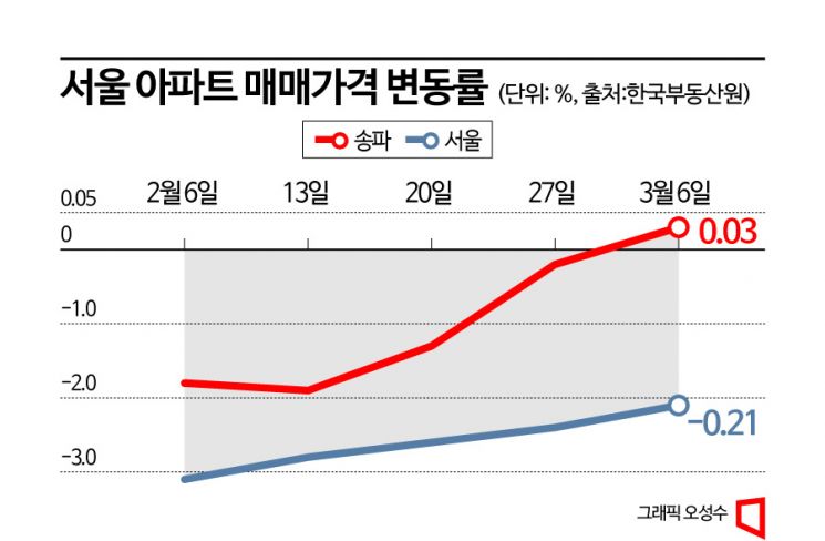이 중 거래량이 급격하게 늘어난 송파구(191건)는 아파트값이 상승 전환했다. 전주 대비 0.03% 올랐다. 보합을 제외하고 지난해 4월 첫 주(0.02%) 이후 11개월(48주) 만에 첫 상승이다.