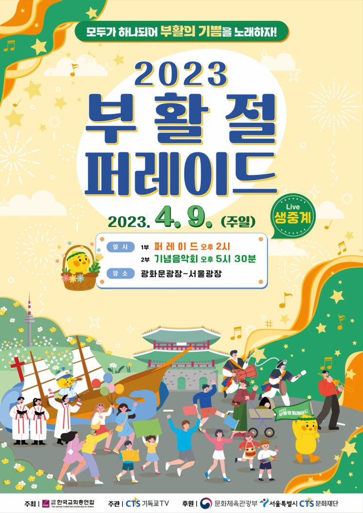 부활절을 맞아 오는 9일 오후 2시 광화문 일원에서 ‘2023 이스터 퍼레이드’(부활절 퍼레이드)가 열린다. 한국교회총연합(한교총)이 주최하고 CTS기독교TV가 주관하는 행사에는 61개팀 5000여명이 참여할 예정이다.
