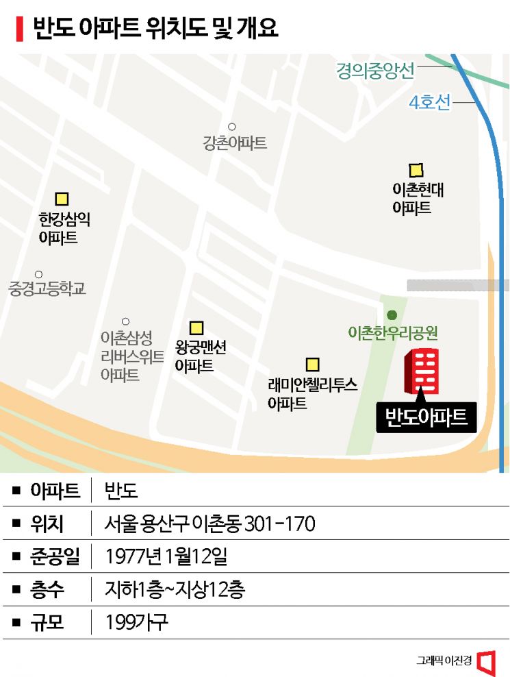 18일 정비업계에 따르면 용산구청은 지난 15일 반도 아파트 재건축을 위한 정밀안전진단 용역을 발주했다. 1977년 이촌 한강변에 준공된 이 아파트는 최고 12층, 2개동, 199가구 소규모 단지다.