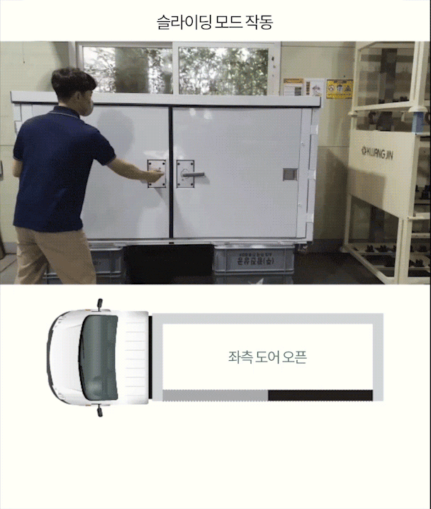이 회사는 적재함 측면에 슬라이딩·스윙 기능을 위해 각각 가이드레일과 힌지를 적용했다. 스윙 손잡이를 위로 올리면 가이드레일과 도어 간 체결이 해제돼 문을 여닫이로 개폐할 수 있다. 스윙 손잡이가 수평인 상황에서 슬라이딩 손잡이를 당기면 스윙 힌지 부분의 체결부가 해제돼 가이드레일을 따라 문이 열린다.