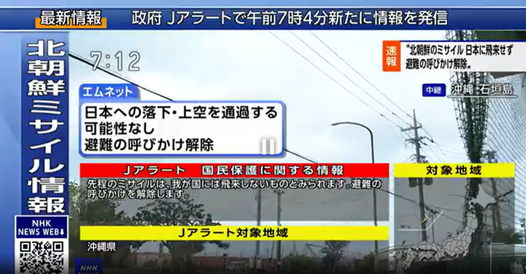 이후 정부는 오전 7시 4분 "북한에서 미사일이 오키나와 방향으로 발사된 것으로 보인다고 발표했지만, 일본에 낙하하거나 상공을 통과할 가능성이 없어진 것이 확인됐다"며 피난 명령을 해제했다.