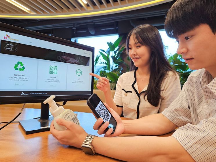 SK지오센트릭 구성원들이 QR코드로 블록체인 기반 플라스틱 리사이클(재활용) 소재 이력 플랫폼에 접속해 플라스틱 소재 정보를 확인하고 있다. 사진제공=SK지오센트릭