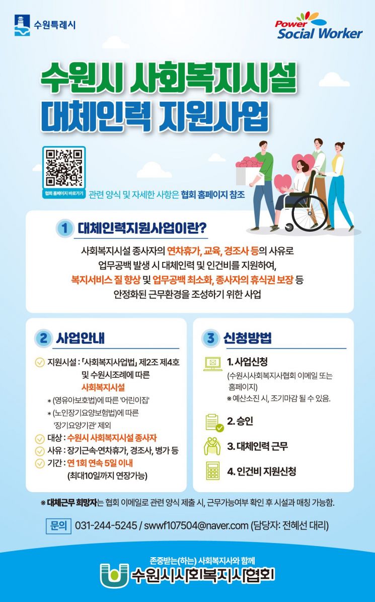 수원시 관계자는 "대체인력 지원사업은 수원시 사회복지시설 종사자 처우개선 사업의 일환으로 추진되는 사업"이라며 "사회복지시설 종사자들의 처우개선을 위해 더 노력하겠다"고 전했다.
