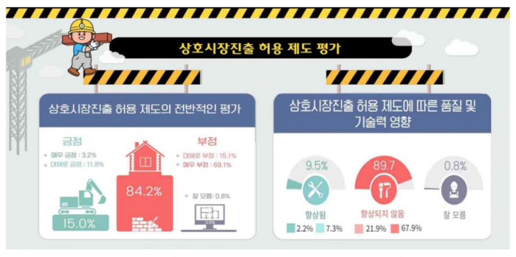 8일 대한건설정책연구원이 리얼미터에 의뢰해 지난달 17~24일 종합·전문건설업체 기업인 1014명을 상대로 설문 조사한 결과, 건설업체 대표 84.2%(매우 부정적 69.1%, 대체로 부정적 15.1%)는 상호 시장 진출 허용제에 '부정적으로 생각한다'고 답했다. '긍정적으로 생각한다'는 답변은 15.0%(매우 긍정적 3.2%, 대체로 긍정적 11.8%)에 그쳤다.