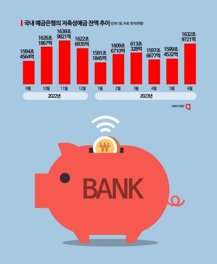 이후 시장금리가 내려가며 예·적금 금리도 하락하자 그해 12월부터 올해 4월까지 총 4조2314억원 순감했다. 반등 기미는 올해 5월부터 나타났다. 6월 한 달 동안에만 33조5189억원 순증 기록을 썼다. 현재까지 증가세를 이어오고 있을 거라는 게 금융권 예측이다.