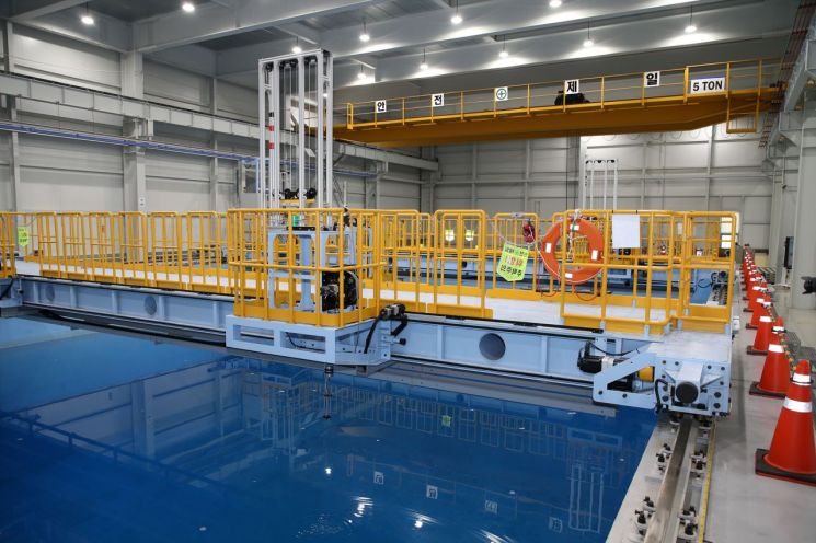 모형선들을 지나면 예인(曳引) 수조(Towing Water Tank)가 나온다. 모형선을 물에 띄워 예인차로 끌며 선박의 저항·자항·운동·조종 성능을 시험한다. 이날은 공사 중이라 직접 볼 순 없었다. 예인 수조는 길이 300m,폭 16m, 담수량 3만3600t의 세계 최대 규모를 자랑한다. 2018년 시흥R&D캠퍼스개소와 동시에 건립된 이 수조는 업계 최신 설비다. 최대 7m까지 수심을 조절할 수 있어 상선과 함정에 이르기까지 다양한 선박을 대상으로 맞춤식 시험이 가능하다.