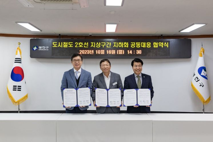 광진구(구청장 김경호)가 16일 광진구청 기획상황실에서 성동구(구청장 정원오), 송파구(구청장 서강석)와 ‘도시철도 2호선 지상구간 지하화 공동 대응’ 업무협약을 체결했다.