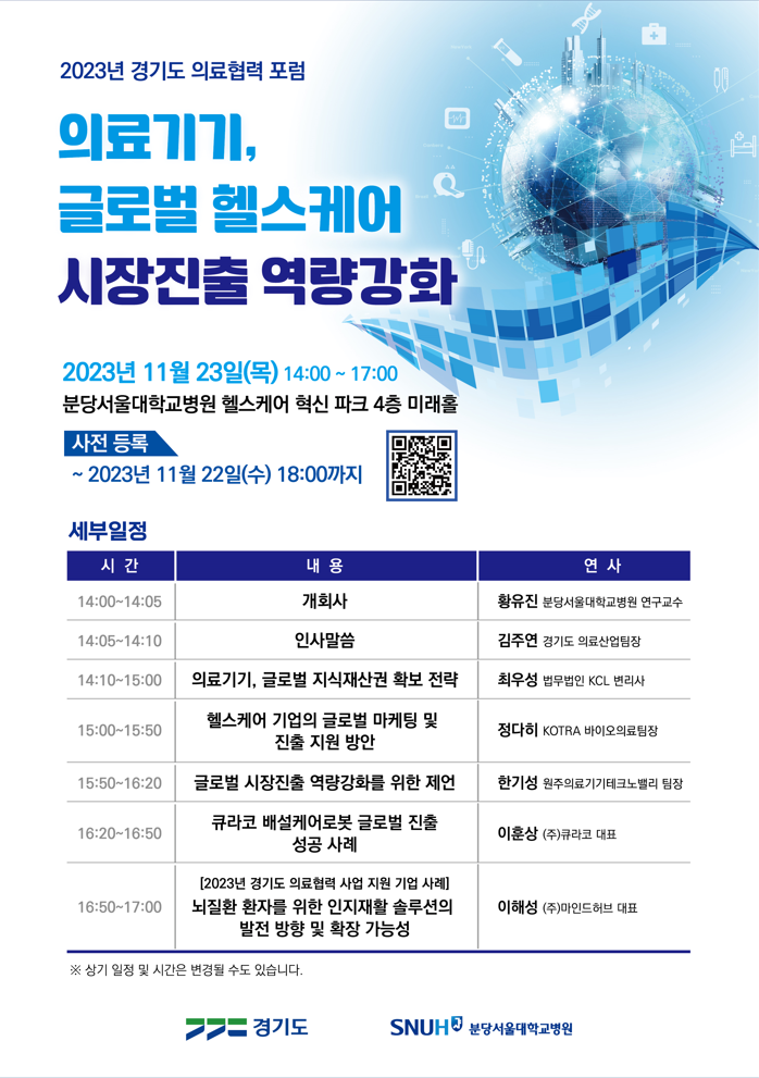경기도는 23일 분당서울대학교병원 헬스케어혁신파크 미래홀에서 ‘의료기기, 글로벌 헬스케어 시장진출 역량강화’를 주제로 경기도 의료협력 정기포럼을 마련한다고 22일 밝혔다.
