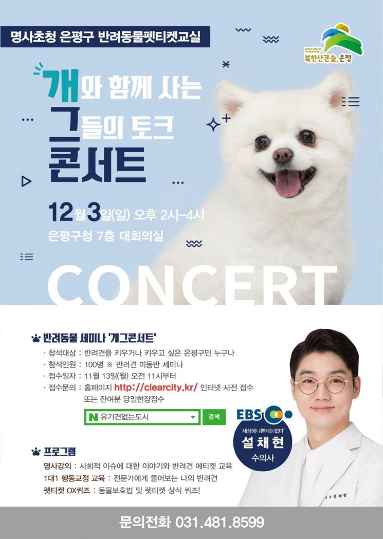 서울 은평구(구청장 김미경)는 12월 3일 은평구청 7층 대회의실에서 ‘명사초청 반려동물 펫티켓 교실 개그콘서트’를 개최한다.