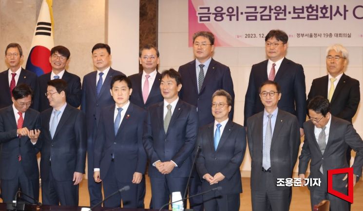 6일 서울 종로구 정부서울청사에서 열린 금융회, 금감원 보험업계 CEO간담회에서 김주현 금융위원장과 이복현 금감원장 등 보험업계 대표들이 기념촬영을 위해 자리를 잡고 있다. 이날 회의는 비공개로 진행됐다. 사진=조용준 기자 jun21@