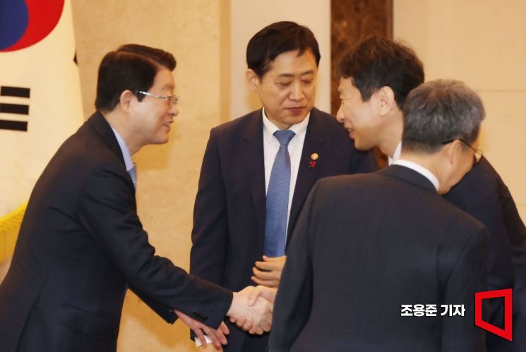 6일 서울 종로구 정부서울청사에서 열린 금융회, 금감원 보험업계 CEO간담회에서 이복현 금감원장이 정희수 생명보험협회장과 악수를 하고 있다. 이날 회의는비공개로 진행됐다. 사진=조용준 기자 jun21@