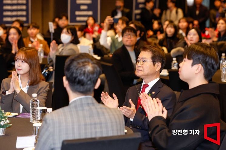 이정식 고용노동부 장관이 6일 서울 종로구 JW메리어트 동대문에서 열린 '2023 미래내일 일경험 콘퍼런스'에서 일경험 공모전 수상 청년들과 박수치고 있다.