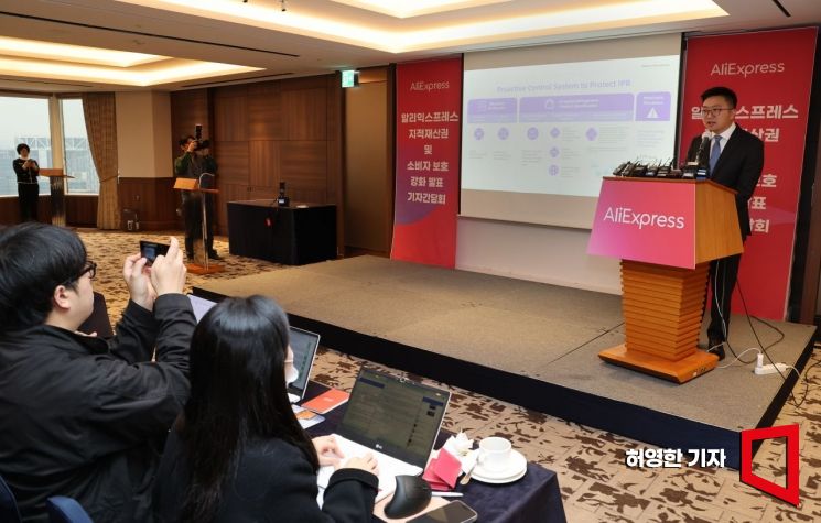 글로벌 온라인 마켓플레이스 알리익스프레스가 6일 서울 롯데호텔에서 '지적재산권 및 소비자 보호 강화' 발표 기자간담회를 열었다. 레이 장 알리익스프레스 코리아 대표가 가품과 불량 판매자 등 소비자 권익 침해 방지 방안을 이야기하고 있다.