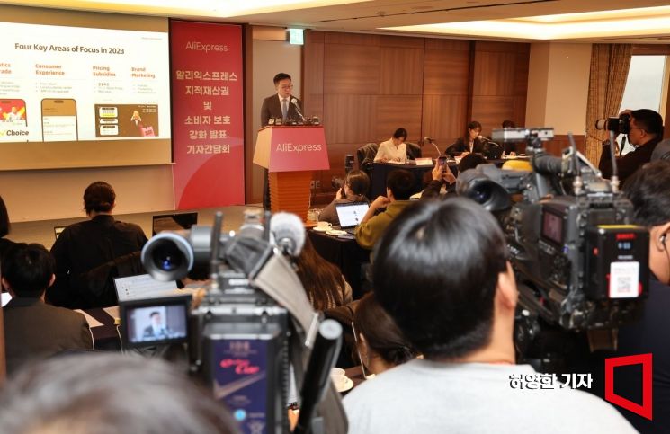 글로벌 온라인 마켓플레이스 알리익스프레스가 6일 서울 롯데호텔에서 '지적재산권 및 소비자 보호 강화' 발표 기자간담회를 열었다. 레이 장 알리익스프레스 코리아 대표가 가품과 불량 판매자 등 소비자 권익 침해 방지 방안을 이야기하고 있다.