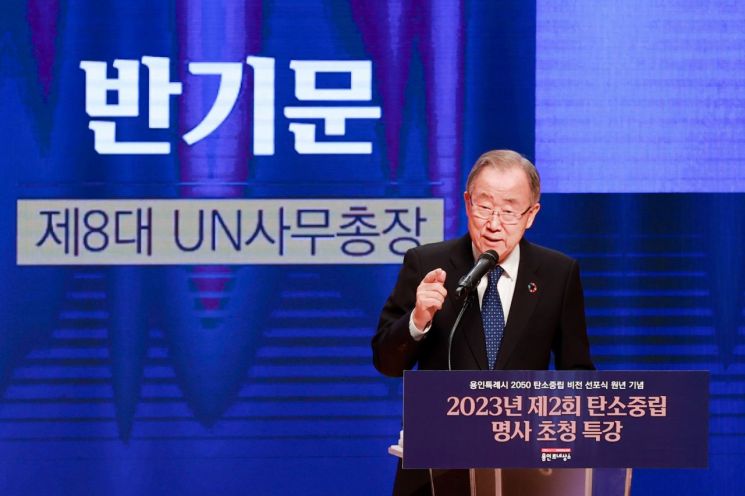 반기문 전 유엔 사무총장이 5일 용인시청 에이스 홀에서 열린 제2회 탄소중립 명사 초청 특강을 통해 기후위기 극복의 중요성을 강조했다. 반 전 총장은 외교부 장관, 유엔사무총장, 대통령 직속 '국가기후환경회의 위원장'을 역임하고 현재 '보다 나은 미래를 위한 반기문 재단' 이사장과 국제올림픽위원회(IOC) 윤리위원장으로 활동 중이다.