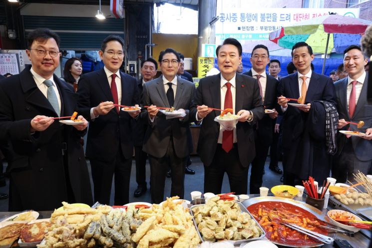 원본보기 아이콘윤 대통령은 이어 시장 내 분식집에 들러 동행한 박형준 부산시장, 이재용 삼성전자 회장, 최재원 SK 수석부회장, 구광모 LG 회장, 김동관 한화 부회장, 조현준 효성그룹 회장 등과 함께 떡볶이, 빈대떡, 비빔당면 등을 먹었다.