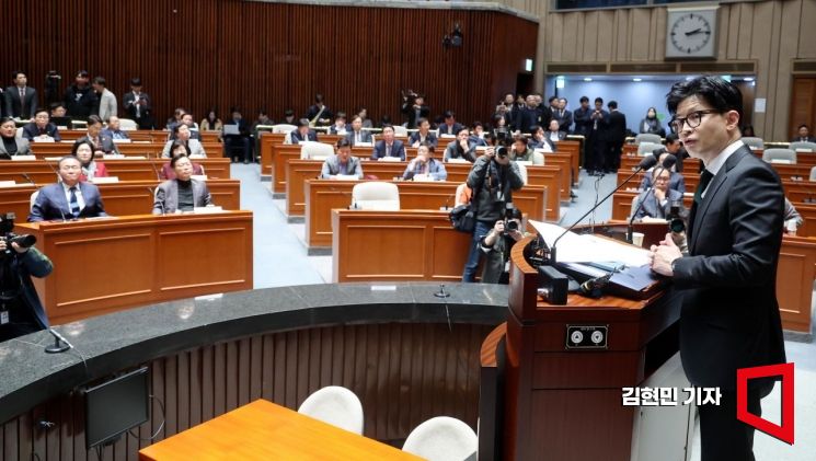 한동훈 법무부 장관이 6일 국회 예결위회의장에서 열린 국민의힘 정책의원총회에서 '출입국 이민관리청 신설 방안'에 대해 제안설명을 하고 있다. 사진=김현민 기자 kimhyun81@