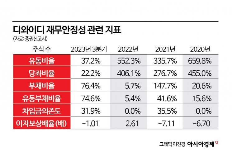 올해 3분기 기준 디와이디의 유동비율과 부채비율은 각각 37.20%, 76.43%로 집계했다. 지난해 말 기준 552.29%, 5.74%에서 악화됐다. 회사 측은 재무 안정성 강화를 위해 주요 사업인 화장품 부문에서 수익 극대화를 위한 신제품 개발 및 마케팅 활동을 적극적으로 진행할 것이라고 설명했다.