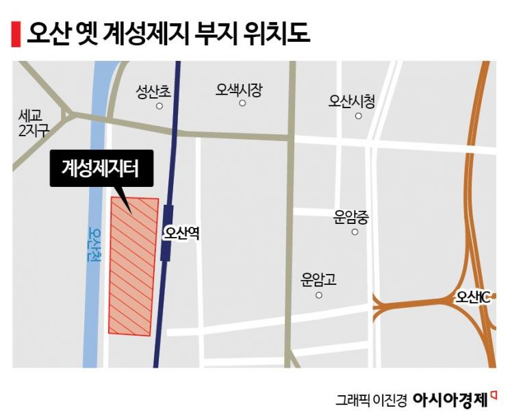 옛 계성제지 부지는 오산시 오산동 637에 위치한 11만2000여㎡의 땅이다. 부지는 경부선과 전철 1호선 오산역 서측에 맞닿아 있는 교통 요지다. 오산천을 경계로 부지 서쪽에는 세교2지구가 자리 잡고 있는데다 최근 정부가 한차례 개발이 좌초됐던 세교3지구를 공공주택지구 예정지로 지정하면서 부지 개발 방안에 대한 관심도 높아지고 있다.