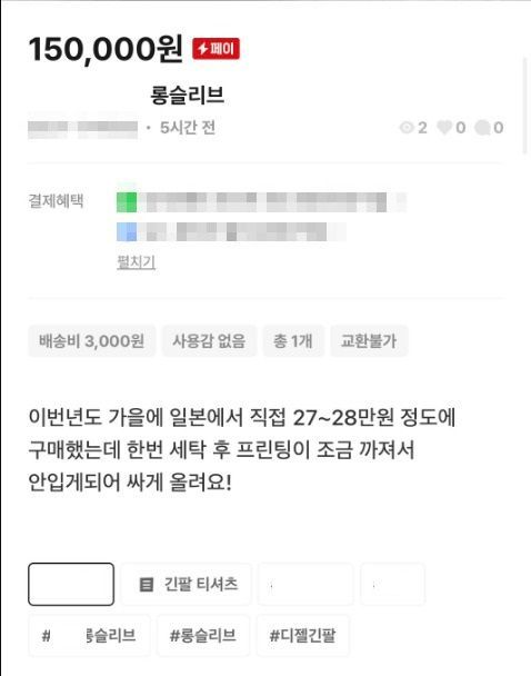 B씨는 지난달 중순, 인터넷 중고거래 앱(애플리케이션)을 이용해 팬으로부터 선물 받은 브랜드 제품 상의를 15만원에 판매했다. 제품 설명란에는 "이번 연도 가을에 일본에서 직접 27만~28만원 정도에 구매했다. 한번 세탁 후 프린팅이 조금 까져서 안 입게 돼 싸게 올린다"고 판매 이유를 설명했다.