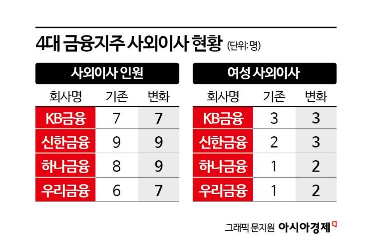 금융지주회사들은 이번 신규 추천으로 사외이사 숫자도 확대했다. 하나금융은 사외이사 1인을 더해 사외이사 정원을 8명에서 9명으로 늘렸다. 우리금융도 6명에서 7명으로 1명 증원됐다. KB금융은 7명, 신한금융은 9명을 유지한다. 이로써 4대 금융의 사외이사 숫자는 종전 30명에서 32명으로 2명 늘게 됐다.