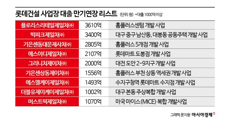 이 밖에 대구 중구 남산동과 대봉동 공동 주택 개발사업 시행사(3400억원), 롯데마트 도봉점 개발 시행사(2107억원), 대전 도안 2-9지구 개발 시행사(2000억원) 등도 각각 만기 도래한 대출을 연장했거나 조만간 연장할 예정이다.