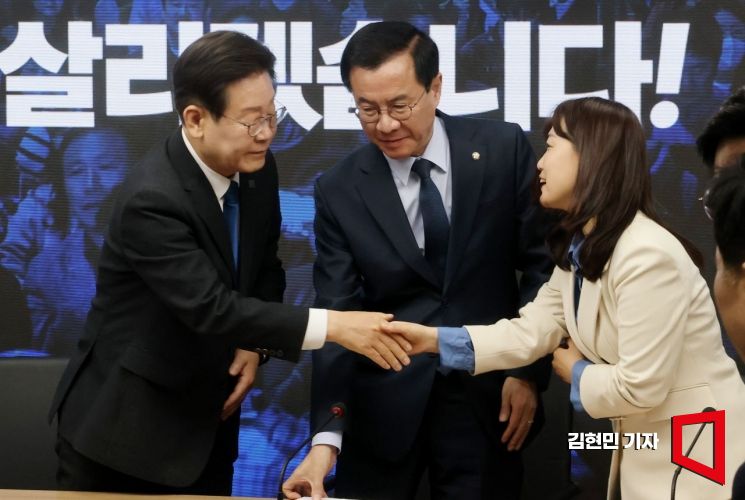 이재명 더불어민주당 대표가 11일 서울 여의도 중앙당사에서 열린 민주당·민주연합 합동 중앙선대위회의 겸 해단식에서 윤영덕, 백승아 더불어민주연합 공동대표와 악수하고 있다. 사진=김현민 기자 kimhyun81@