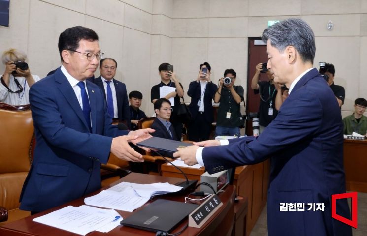 조지호 경찰청장 후보자가 29일 국회 행정안전위원회에서 열린 인사청문회에서 신정훈 위원장에게 선서문을 제출하고 있다. 사진=김현민 기자 kimhyun81@