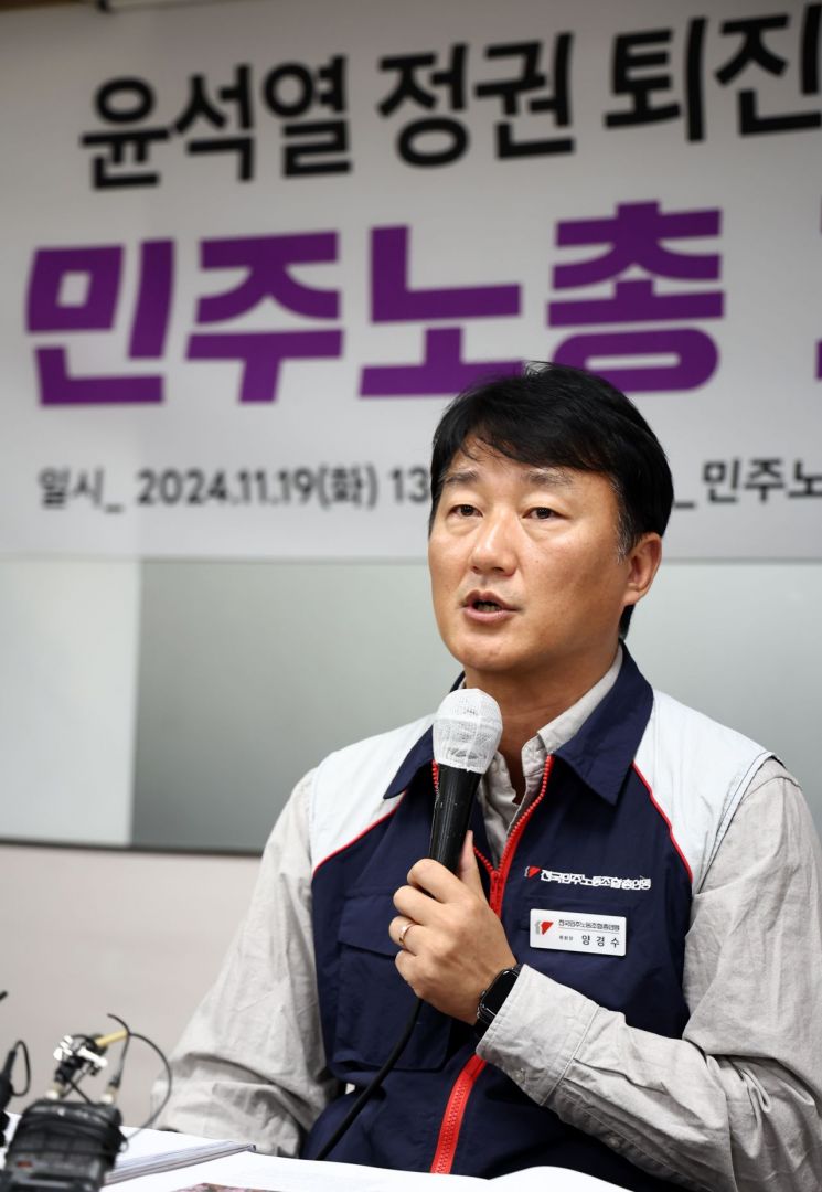 양 위원장은 19일 오후 서울 중구 민주노총 교육장에서 열린 기자간담회에서 지난 9일 열린 집회 당시의 상황과 경찰 대응에 대해 "윤석열 정권의 존립이 흔들리는 상황에서 경찰이 광장을 막고 시민들의 입을 틀어막으려고 했다"고 주장했다.