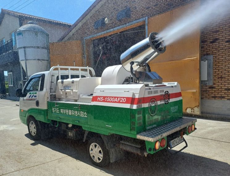 경기도북부동물위생시험소가 지난 16일 양주시 소재 양돈농가에서 도내 올해 세 번째 아프리카돼지열병이 발생하자 취약 농장 및 주변 도로를 집중 소독하고 있다. 경기도 제공