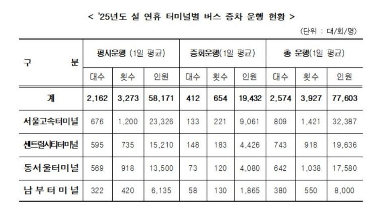 증편 운행은 오는 24일부터 2월3일까지 11일간 실시된다. 서울 시내 고속버스터미널인 ▲서울고속터미널 ▲센트럴시티터미널 ▲동서울터미널 ▲서울남부터미널 4개소에서 평시보다 1일 평균 운행 횟수 654회, 인원 1만9000여명을 늘려 총 7만7000여명의 승객을 수송한다.
