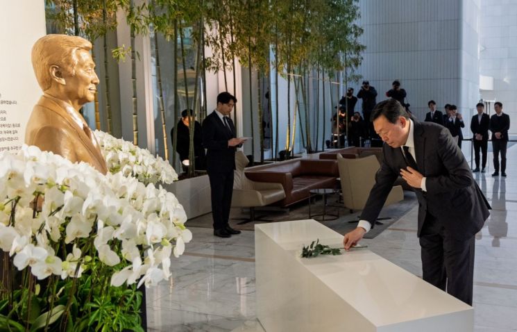신동빈 롯데 회장이 신격호 창업주 5주기를 맞아 서울 송파구 롯데월드타워 1층에 마련된 신 창업주 흉상에 주요 경영진과 함께 헌화하며 추모식을 하고 있다. 롯데지주 제공