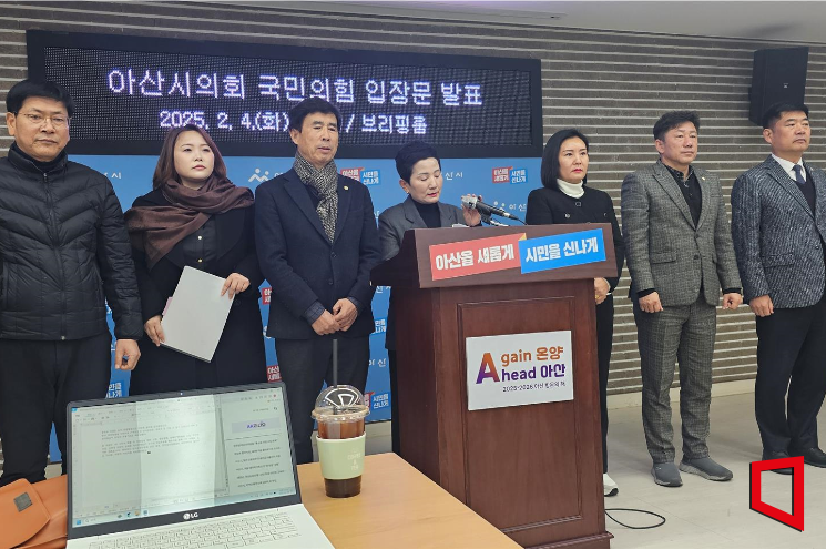 국민의힘 소속 충남 아산시의회 의원들이 4일 오전 시청 브리핑실에서 기자회견을 열고 홍성표 의장의 의원직 사퇴 등을 촉구했다.