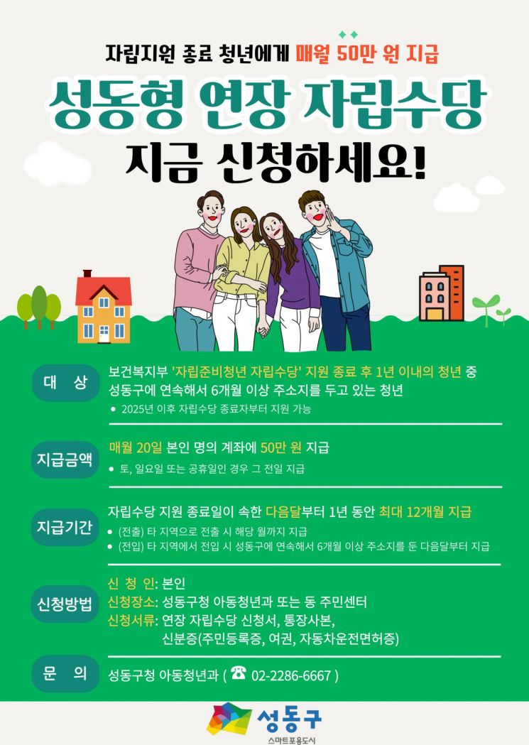 2025년에 정부 자립수당 지원이 종료되는 청년을 시작으로 순차적인 지원을 이어갈 방침으로, 지원사업 신청은 신분증과 통장사본을 지참하여 성동구청 아동청년과 또는 동 주민센터에 신청서를 제출하면 된다.