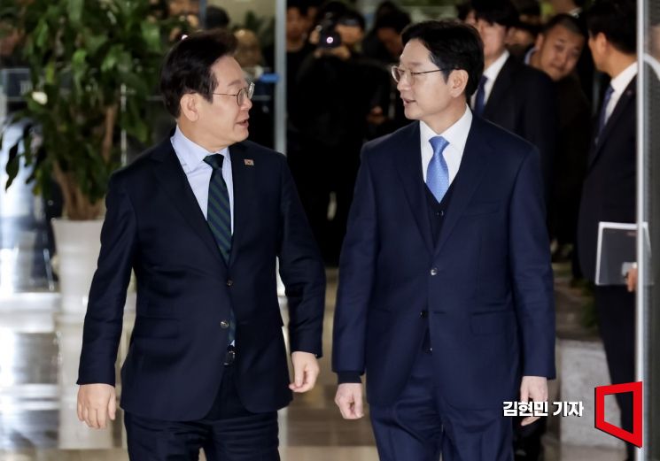 이재명 더불어민주당 대표와 김경수 전 경남지사가 13일 국회에서 만나 회담장으로 들어서고 있다.
