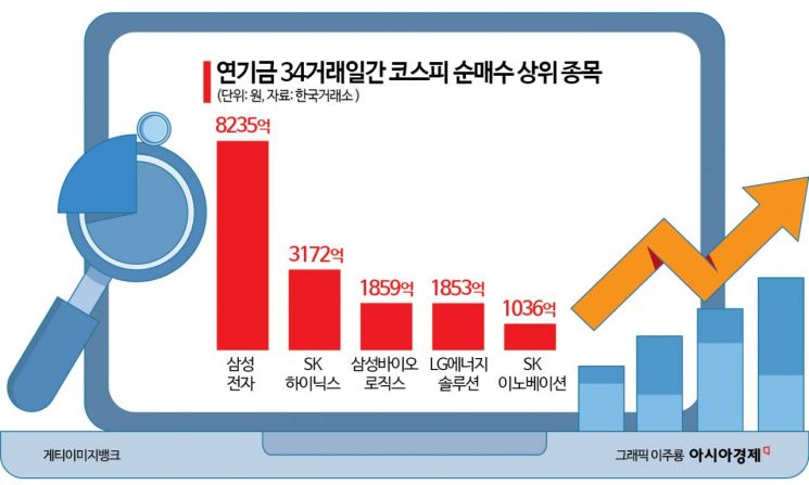 20일 한국거래소에 따르면 연기금은 34거래일 연속 코스피를 순매수(약 3조2000억원)하며 역대 최장 기록을 다시 썼다. 종전 최장 기록인 32거래일(2011년 11월 10일∼12월 23일)을 전날 경신한 데 이어 이날도 734억원어치를 사들이며 기관 매도세에 역행했다. 이 기간 연기금의 순매수 1위 종목은 삼성전자(약 8000억원)다. 같은 기간 외국인 역시 선물시장에서 1조2000억원 순매수하며 힘을 보탰다.