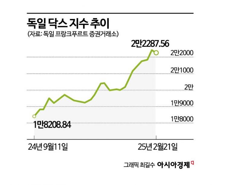 이 같은 기대감에 독일 증시 대표 주가지수인 닥스(DAX)지수는 지난 21일 종가 기준 올해 들어 12% 가까이 오르며 최근 부진한 미국 증시와 대조적인 모습을 보였다. 특히 독일 방위산업체 라인메탈AG는 재정 개혁 후 국방비 지출 확대가 실현되면 가장 큰 수혜를 입을 것이란 전망에 연초 이후 45% 급등하기도 했다.