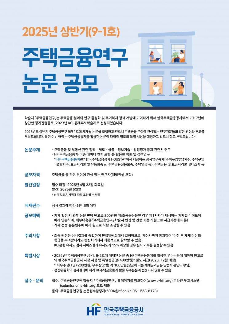 한국주택금융공사(사장 김경환)는 주택금융연구를 활성화하고 주거복지정책을 개발하기 위해 2025년 상반기 ‘주택금융연구‘ 논문 공모를 실시한다고 5일 전했다.