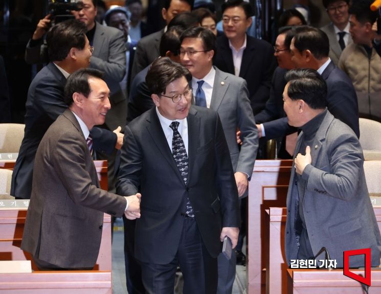 권성동 국민의힘 원내대표가 13일 국회에서 열린 의원총회에 참석하고 있다.