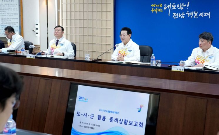 전남도는 25일 도청 서재필실에서 김영록 도지사 주재로 전남도교육청, 전남도경찰청, 전남도체육회, 12개 시군 관계자 등 40여 명이 참석한 가운데 2025 전국생활체육대축전 도-시군 합동 준비상황보고회를 개최했다.